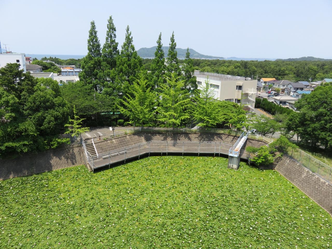 4階の介護の部屋から外を見る。眼下にハスの池。遠くには博多湾と能古島。