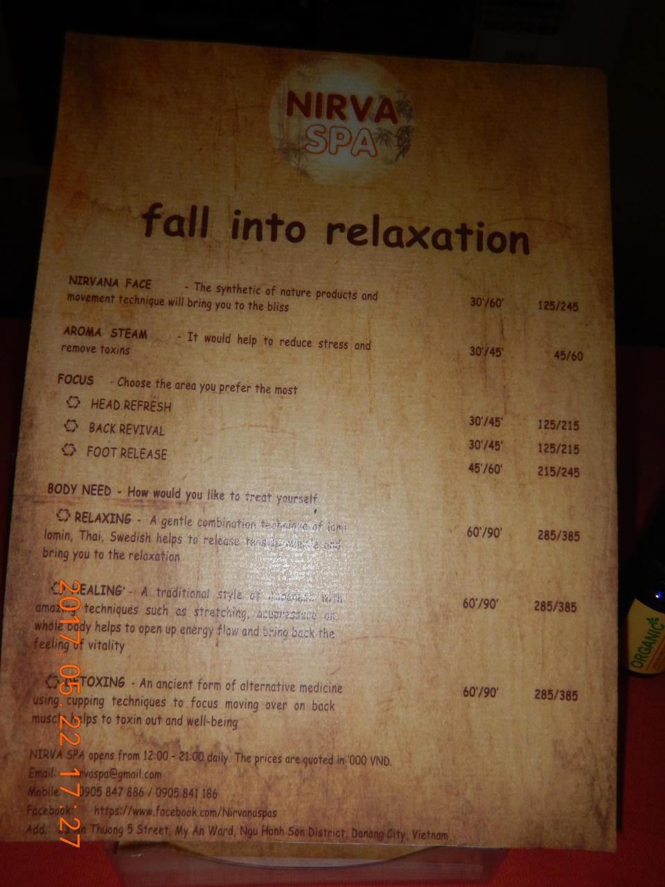 Hatha Spaに行くつもりでタクシーに乗ったが予約せずに行ったのでマッサージできず、一本隣の通りにあるNirva Spaに行った。15分位待ってまっさーじえお受けた。デトックス 90分 385,000vnd (約 1,930円)