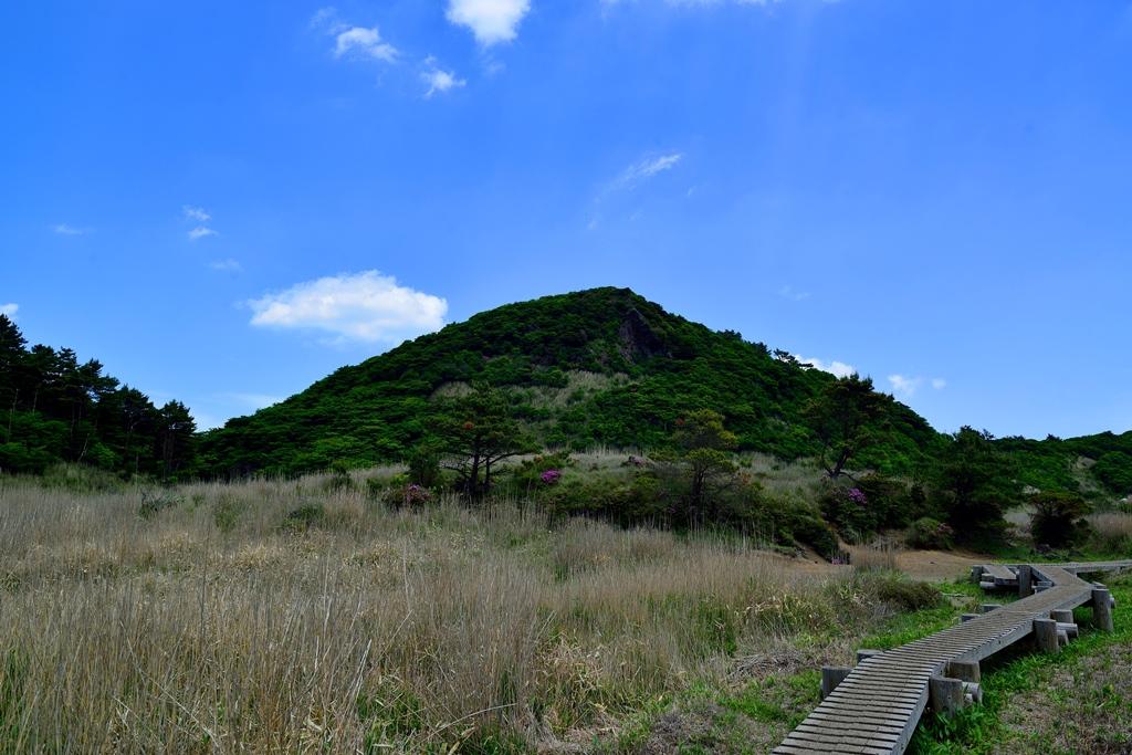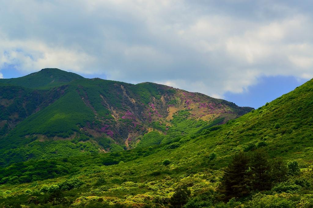 硫黄山の斜面、ミヤマキリシマの群生が見えます。 -