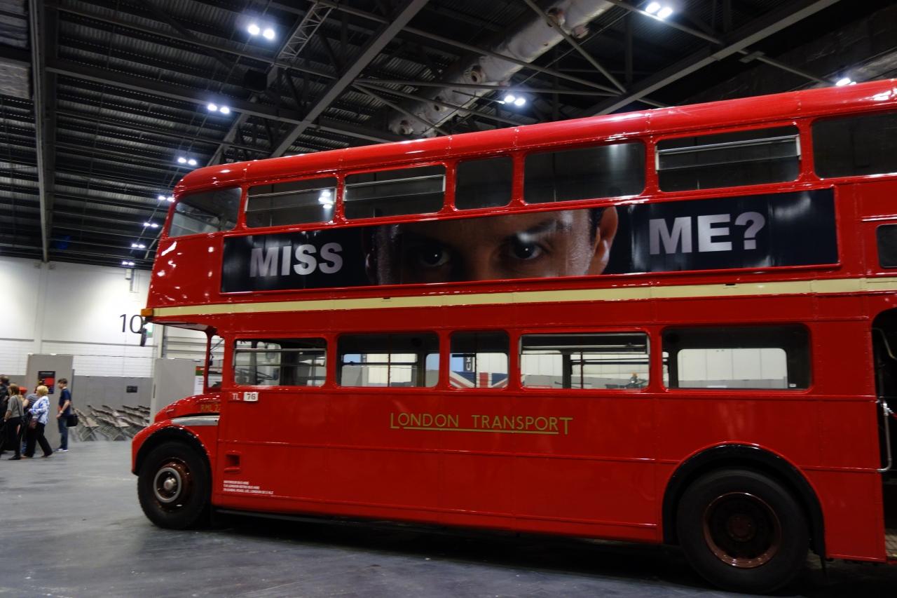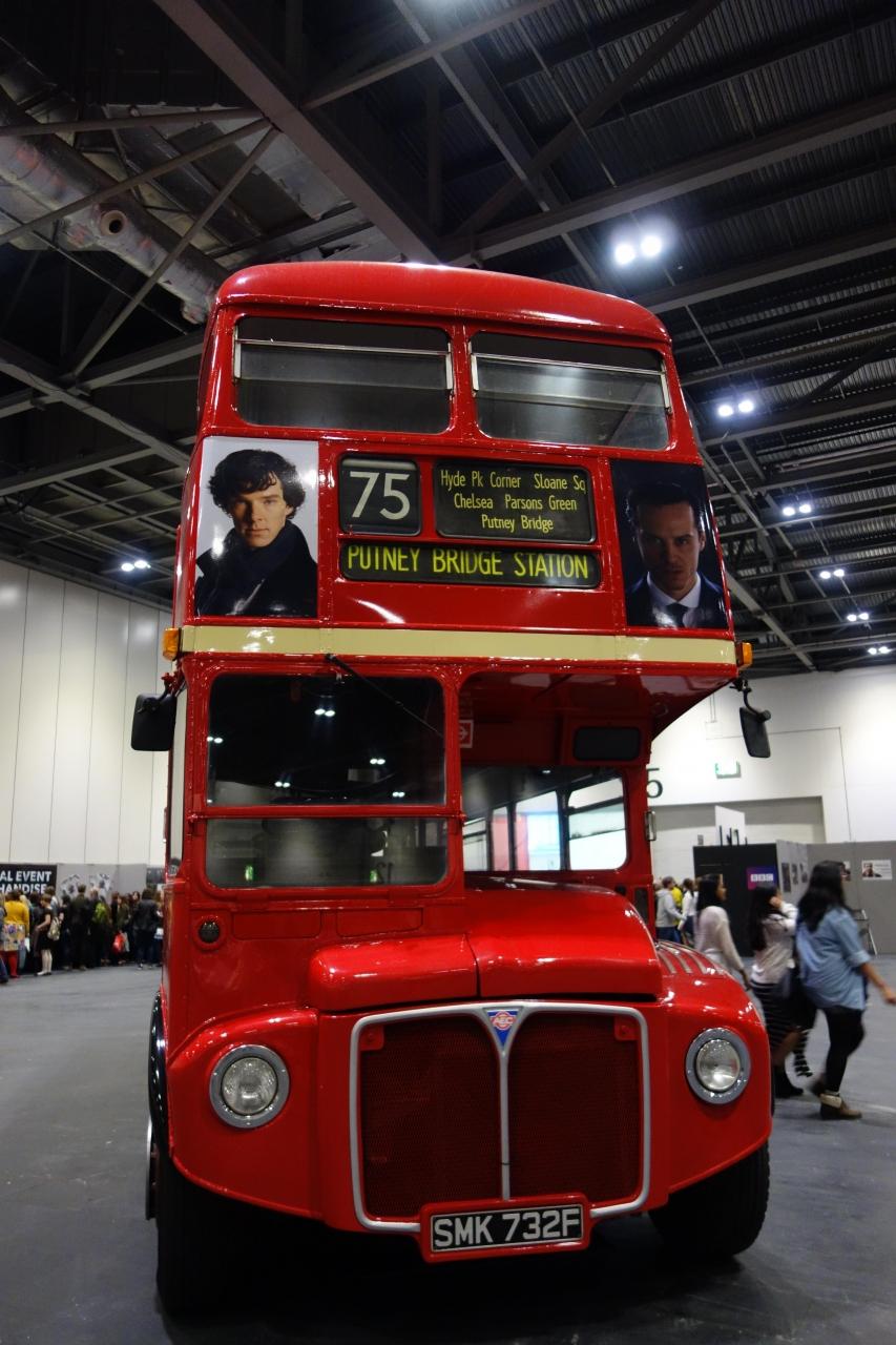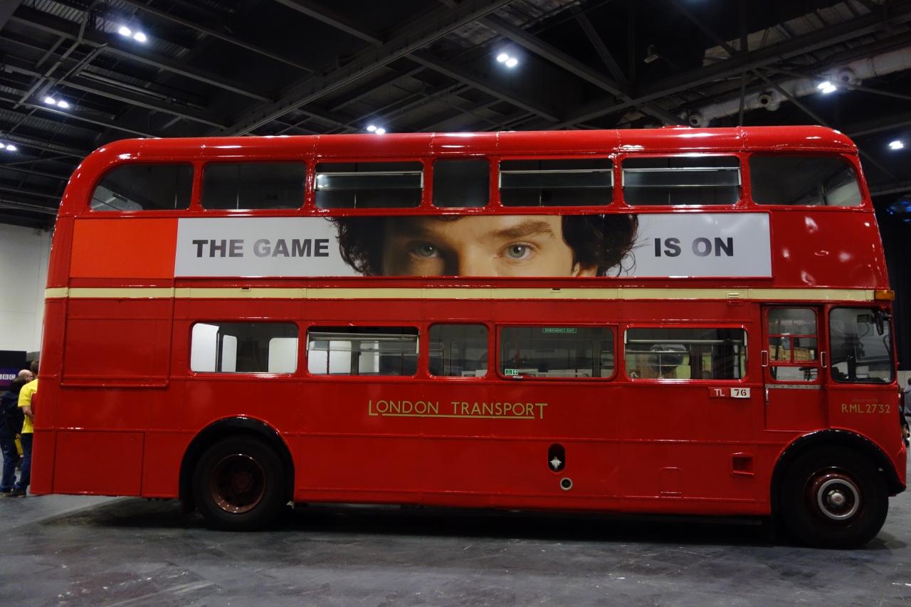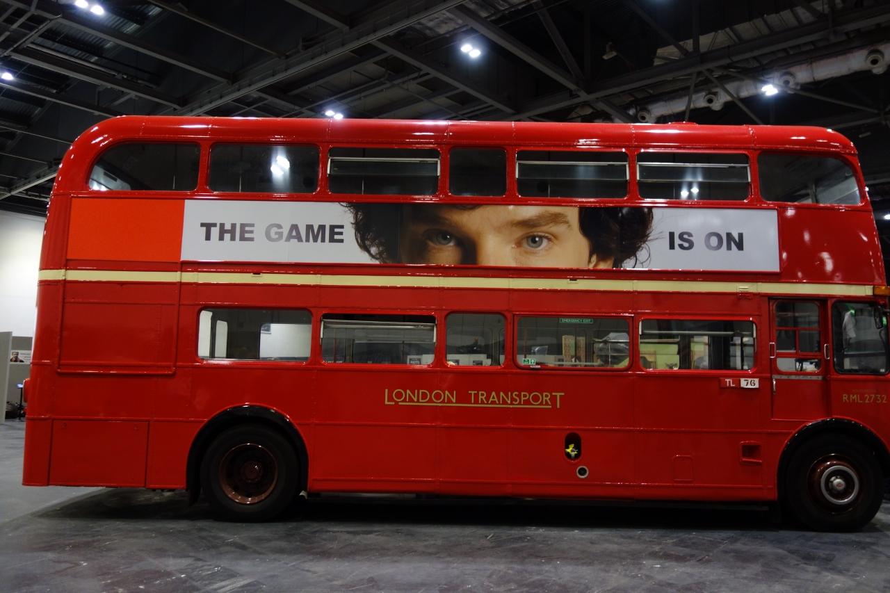 会場に置かれてた赤いバス。カンバーバッチのシャーロックの顔写真と、「The game is on」という第1シーズン第1話の名セリフが車体に書かれています。
