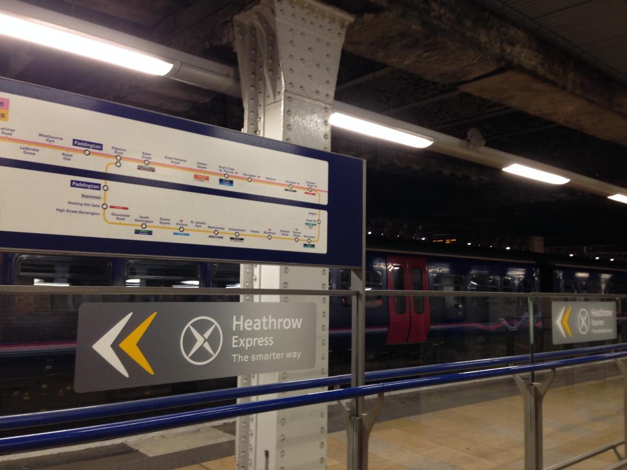 で、夕方、KLMで行くより少し遅い時間にロンドン・ヒースロー空港に到着し、イミグレで1時間以上並ばされ、ヒースロー・エクスプレスでパディントン駅へ(写真)。ここからさらにタクシーで移動して、ロンドンのちょっと外れのホテルに到着したのは、日本の自宅を出てから20時間以上後。老体には長旅、こたえます。チェックイン後、即、爆睡。