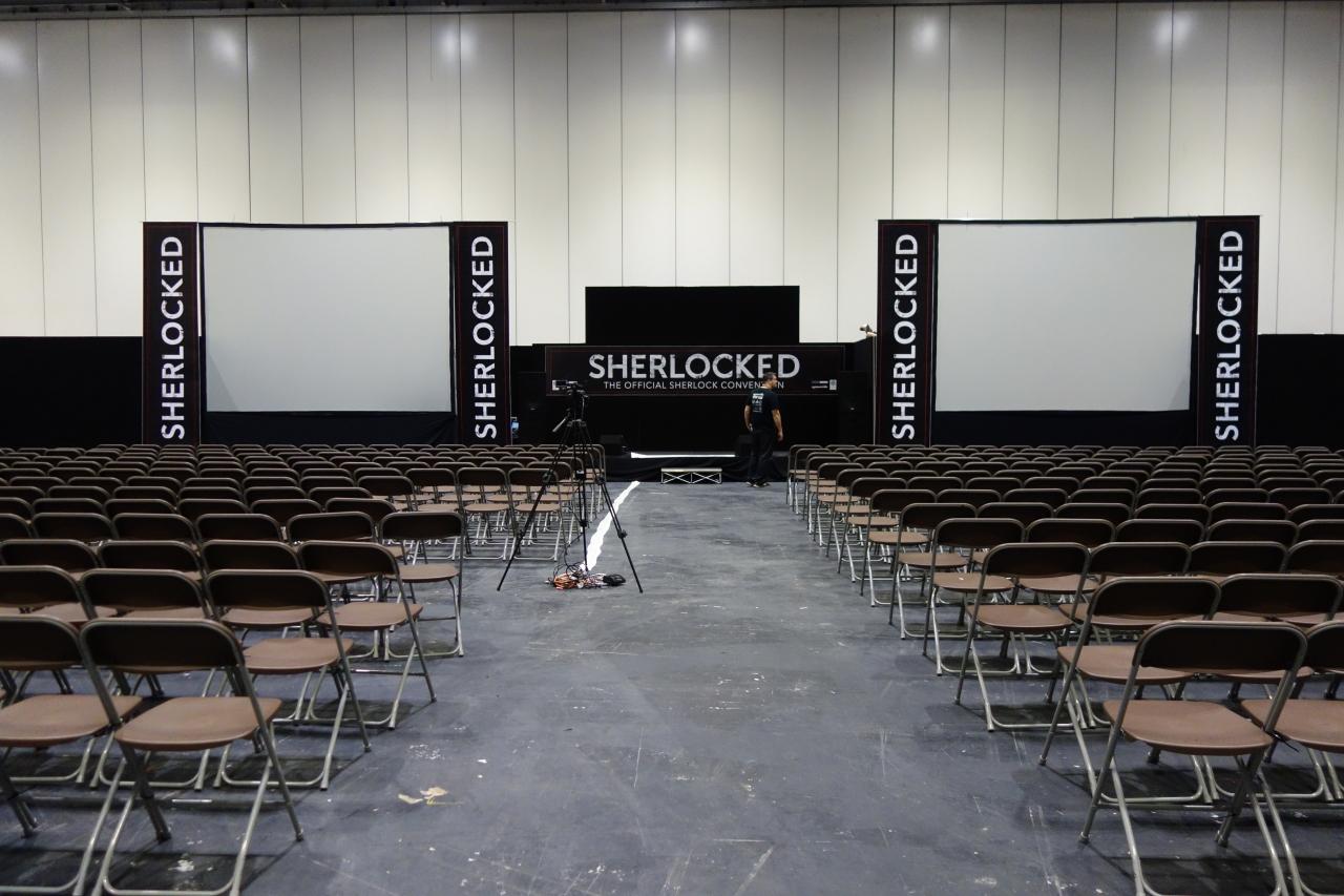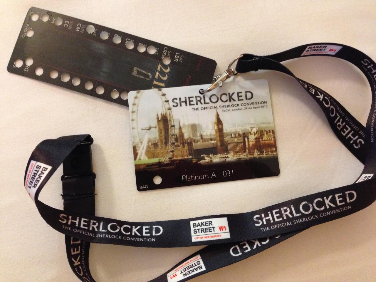 チケットをレジストレーションのところで提示して、この首からぶら下げるパス2種類を受け取ります。(首からぶら下げる紐は、ショップで買いました。)ベイカー街221Bのドアのデザインの方は、チケットの種類ごとに各人の得ている権利(カンバーバッチのサイン、アンドリュー・スコットと写真撮影、など)を行使するたびにパチンと穴が開けられていきます。穴だらけになっているのは、相当頑張って、ほぼ全ての権利を行使した証です。笑。