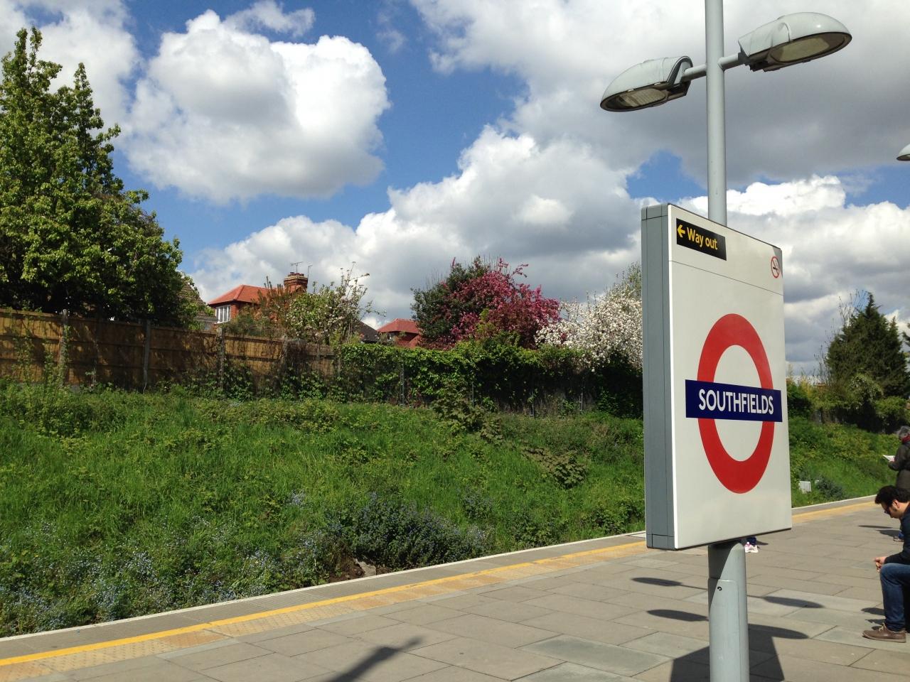 地下鉄サウスフィールズ駅のホームより。地下鉄ディストリクト線で、アールズコートから10分15分という距離(だったと思いますが、うろ覚え)なのに、いきなりこんな、のどかな感じ。