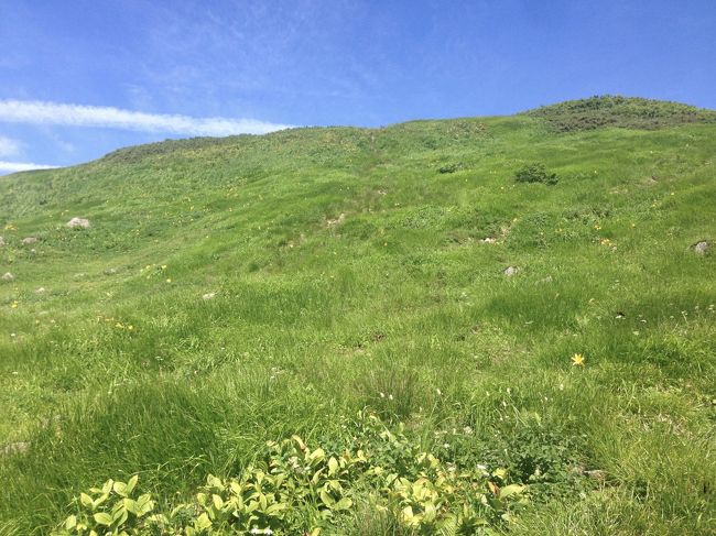 リフトを降りて、姥が岳を目指します。月山山頂とは向き合うような峰ですが、そこまでの道が気持ち良い風と原っぱのような緑、そして花々であふれていました。
