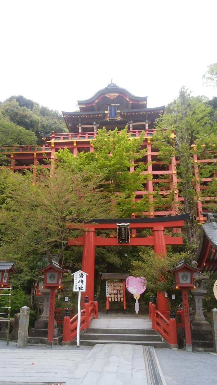 写真下の鳥居の奥は岩崎社、縁結びの神様が祀ってあります。ピンクのハートが目印です。 -
