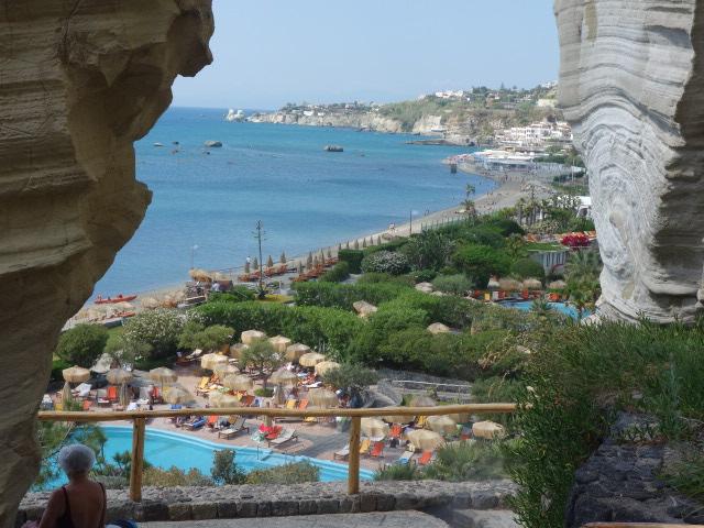 タクシーに切り替え40ユーロで、ホテル・パルマまで行きます。但し、すごい狭い坂を上らないといけないので、麓から坂道を上る電気タクシーもあり、まるでアミューズメントパークの乗り物です。荷物(私以外の3つの大きなカバン)もあり、合計20ユーロもかかります。私だけはタクシーに4人で乗ることを計算して、小さな手持ちカバンにしています。電気タクシー代も毎回要るし高くつくホテルですが、その分部屋からの景色は最高です。以前見た近くのトロピカル温泉からと同じく、眼下にサンタンジェロ湾が見えます。アランドロンの太陽がいっぱいの映画で出てきた美しい地中海です。