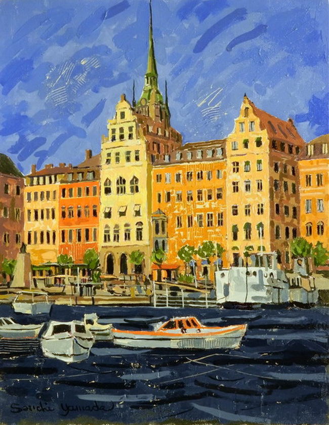 北欧の旅は初めてでしたが、7月はきっとストックホルムは涼しいだろうと思っていたのですが、結構暑い日が続きました。そんなわけで絵は、Sj?bergsplan公園(何と発音するのか分かりません)から運河を隔てて、Kornhamnstorg方面を描きました。最初は木下の日陰で描き始めるのですが、太陽が動いてしまうのでいつの間にかカンカン照りの下で描くことになってしまうことがあります。ここでもそうでした。
