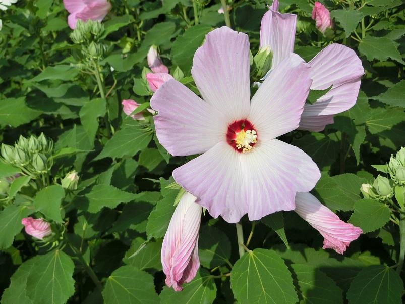 白色の「ムクゲ」の近くには、白色の「アメリカフヨウ」と淡いピンク色をした「アメリカフヨウ」が咲いていました。