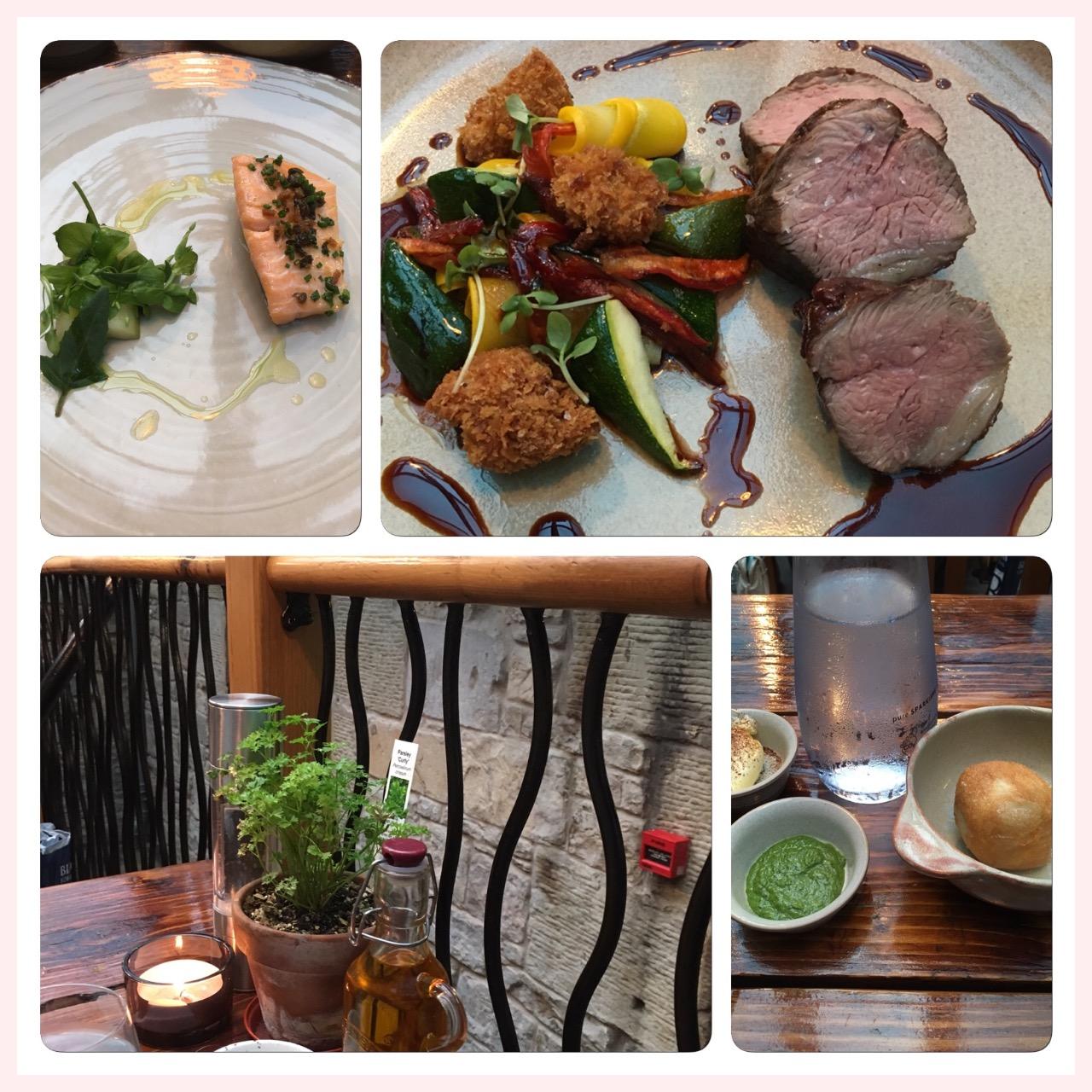 前菜にサーモン、メインはラム、デザートにパンナコッタ。お通しに揚げパンのようなものと2種類のソースがついてきました。この緑色の(バジルと何かの)ソースの美味なこと!ラム付け合わせのお野菜もとっても美味しかったです。もちろんお肉やお魚も。野菜の調理が上手なお店だと思います。