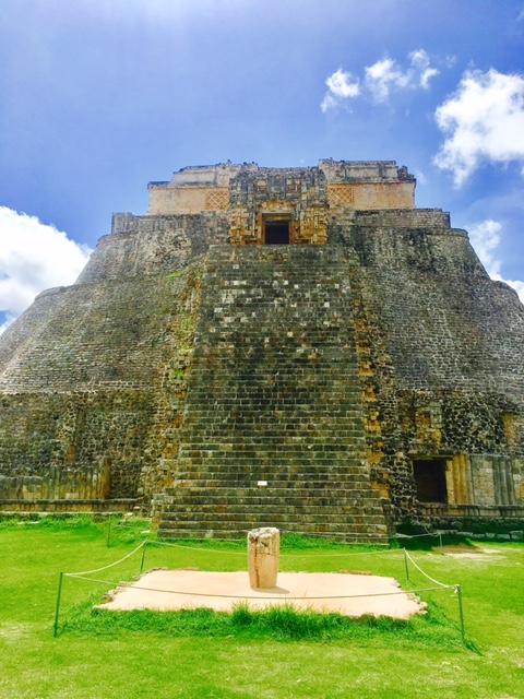 ウシュマルと言えば、魔法使いのピラミッド。魔女が一日で建設したと言う建造物ですが、実際に5回に分けられて建設されています。有名な階段途中に開けられた穴は、4番目の神殿に繋がっていますが、これは発掘の際に間違って開けてしまった穴。。。実際は、反対側に入口があります。