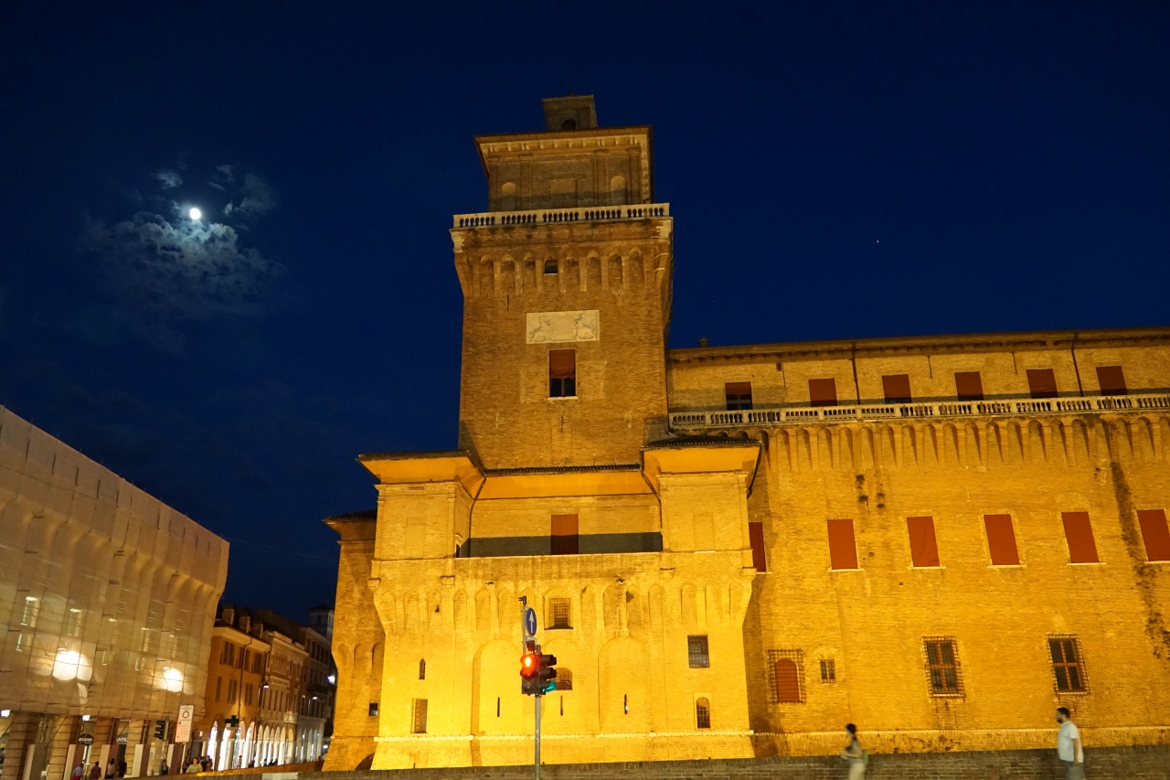 タクシーでブッセート駅まで行き、バスでフィデンツァ駅で下車。ボローニャで乗り換えてフェッラーラに到着です。ホテルはエステンセ城に近いプラティー。