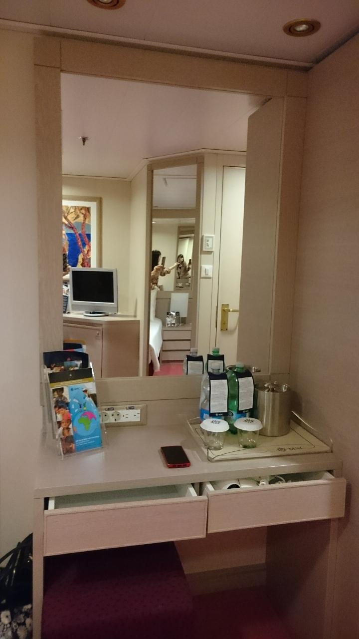 コメントでオーケストラはリネンがぼろぼろ、というのを読んで、古いからぼろいかも、と心配していたけど、オープンスペースも船室もピカピカ。狭いけど、一流ホテルに引けを取らない。(と思う。)丁寧に清掃しているのが良く分かる。1日に2回クリーニングが入るんだって。帰国後、掃除がイヤになると、クルーズの清掃スタッフを思い出すようにしている。フィリピン人の小柄な男の子でした。