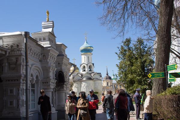 セルギエフ・ポサードの駅に到着して、流れに従って歩いて行ったら、道路を渡った処はバスターミナルでした、これは違うようで右手に抜けて、すぐの通りを右方向に歩いて行きましたが、他に人影はありません、心細くなりましたが、すぐに交差点に出ると、目の前に修道院が見えていました。