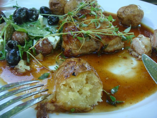 メインはポークソテーに、素揚げの小ぶりのジャガイモ、カマンベールチーズ、オリーブの実、ブドウのような感じのフルーツ。クレソンらしきものを飾りに。