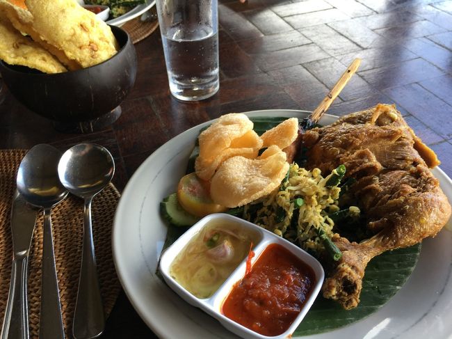 お昼になり、レストランに寄りました。ウブド近辺ですが詳しい地名は分かりません。アヤムゴレンをガイドさんにリクエストしたら田んぼの見えるレストランに連れてってくれたのです。私はアヤムゴレンとスイカジュース。連れはナシチャンプルとウィルキンソンの炭酸水。アヤムゴレンは、揚げすぎだったかな?まあ美味しいかな?2人で3000円くらいでした。