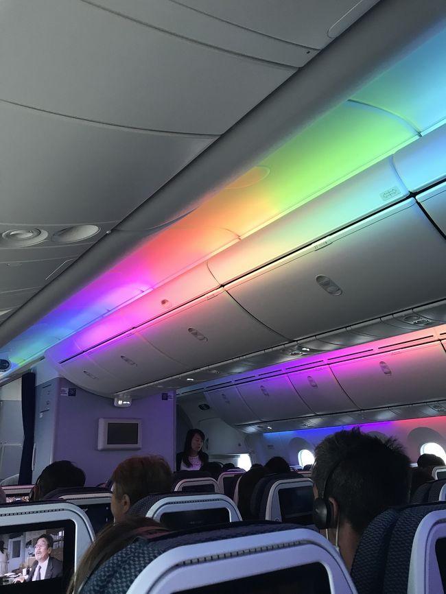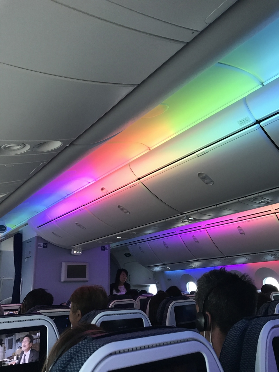 成田空港に着陸態勢に入ったあたりに機内の照明がレインボーに(≧∀≦)