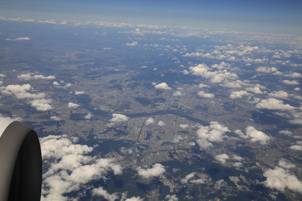 ソウル市内も見えます。写真の真ん中に見える川が漢江です。