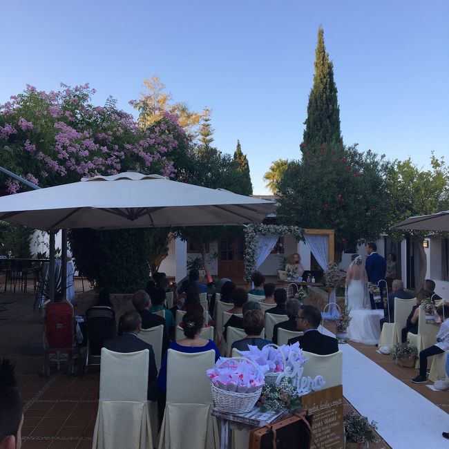 結婚式会場到着です!今日の主役待ち。なんと神父さん大遅刻でした。誓いに後に、立食で生ハムやちょっとしたオードブルがワインなどのアルコールとともに頂きました。暗くなって、大体夜9時頃から室内で披露宴が始まりました。その後は朝方までDJの音楽で踊って飲んで。素敵な結婚式でした。