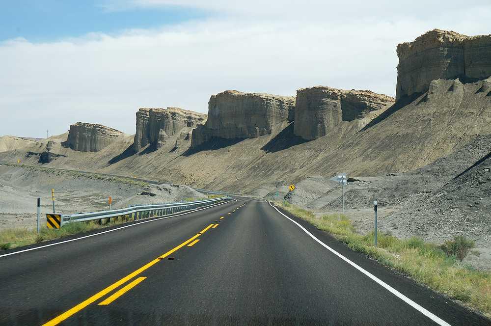 9月17日、キャピトルリーフ国立公園を後にして、24号線をそのまま東に走る。結局、キャピトルリーフは、年間パスを提示することなく通過してしまった。道の前方には、12号線と同じような変わった岩山の風景が広がった。
