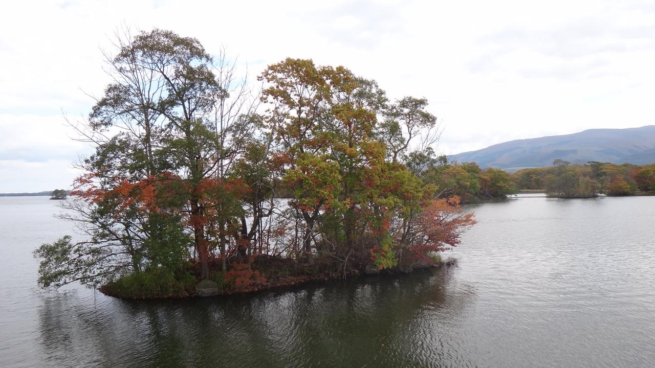 紅葉まっ盛りの大沼の散策路を歩き、深まる紅葉越しに見える駒ヶ岳の遠景を楽しむ。