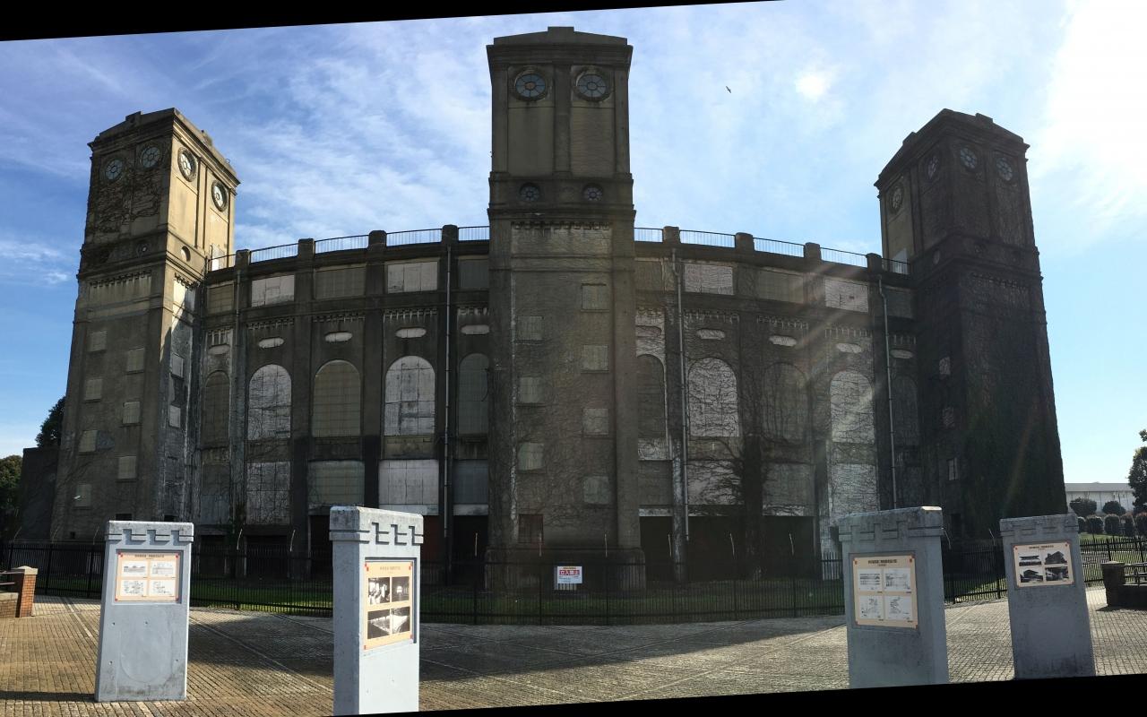 パノラマ撮影しているので湾曲していますが、まっすぐな建物です。 -