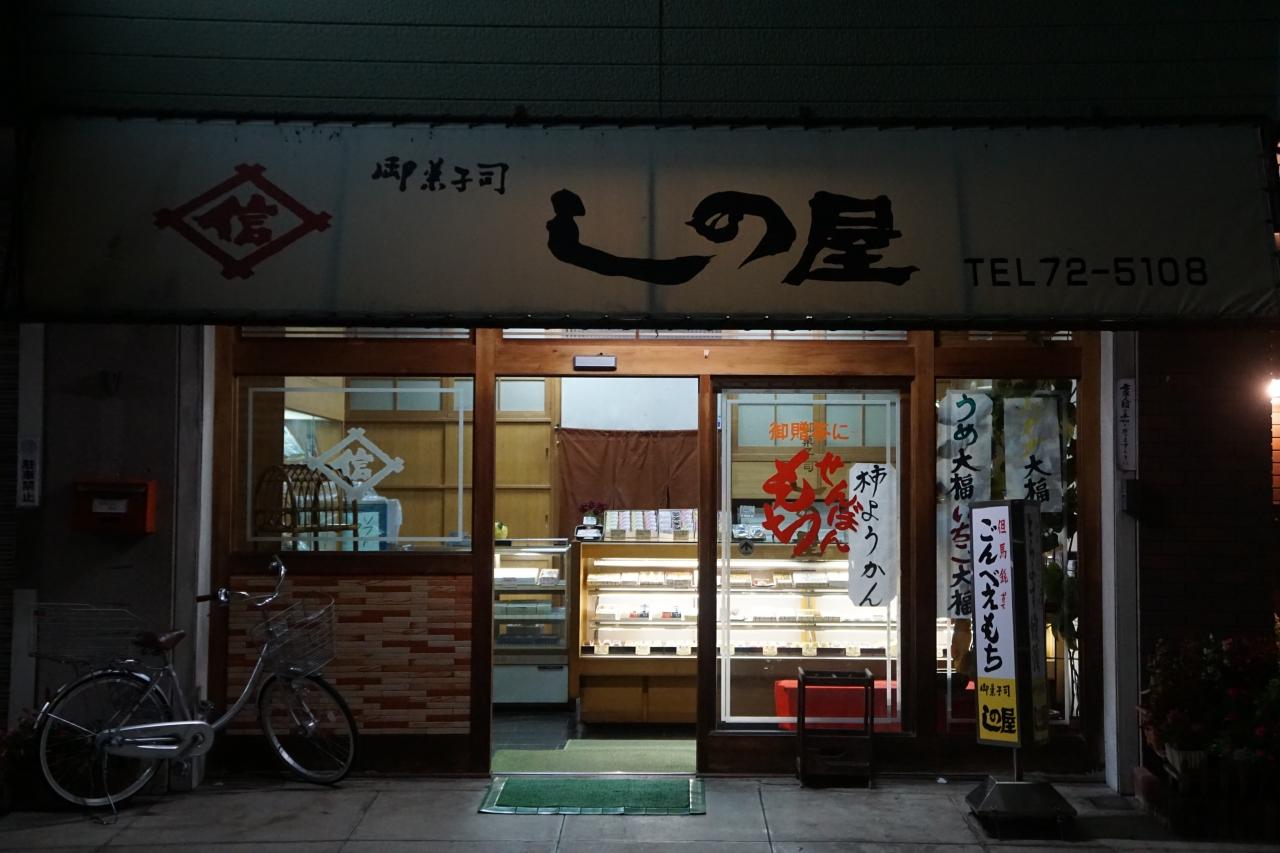 和田山駅前の小さな和菓子屋さんは、しの屋。ごんべえもちという看板が目に入って寄ってみました。「ごんべえもちって、出石の湖月堂でも見ましたけど・・」というと、私は兄弟なんですよという答え。 -