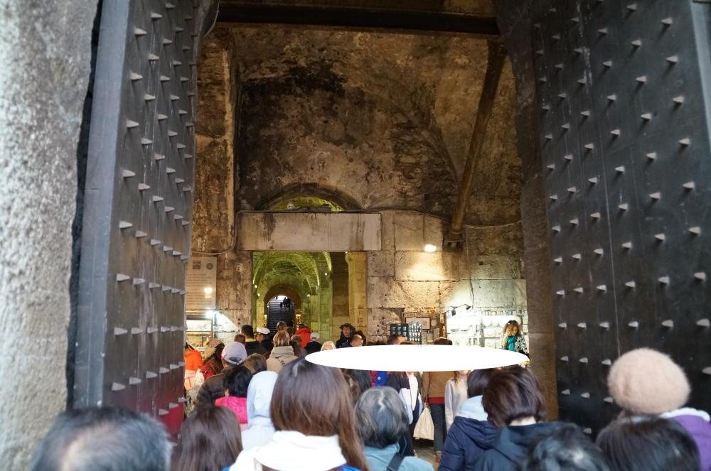 地上はこんな感じで、古代ローマ時代の宮殿の造りが良く解る。ただ、両側の石段に敷いてある座布団はカフェの所有物なので座らないほうが無難。