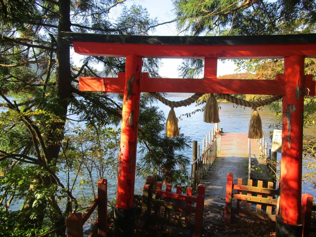 鳥居を正面に見るにはこの階段を下りるといいみたいです。私は滑って湖に落ちるビジョンしか浮かばなかったので行ってません(笑)