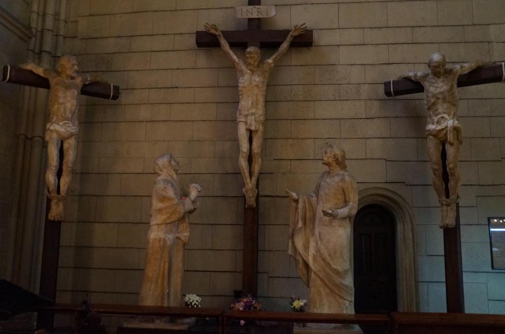 妙に写実的なキリスト磔刑像。左右の罪人達は釘で打たれなかったのね。
