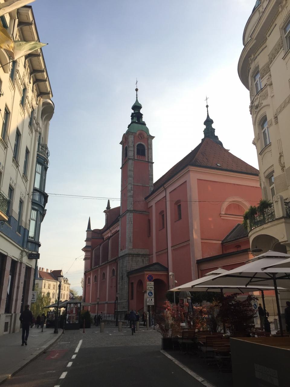 プレシェーレノフ広場に面して、ピンク色のフランシスコ会教会が建ってます。