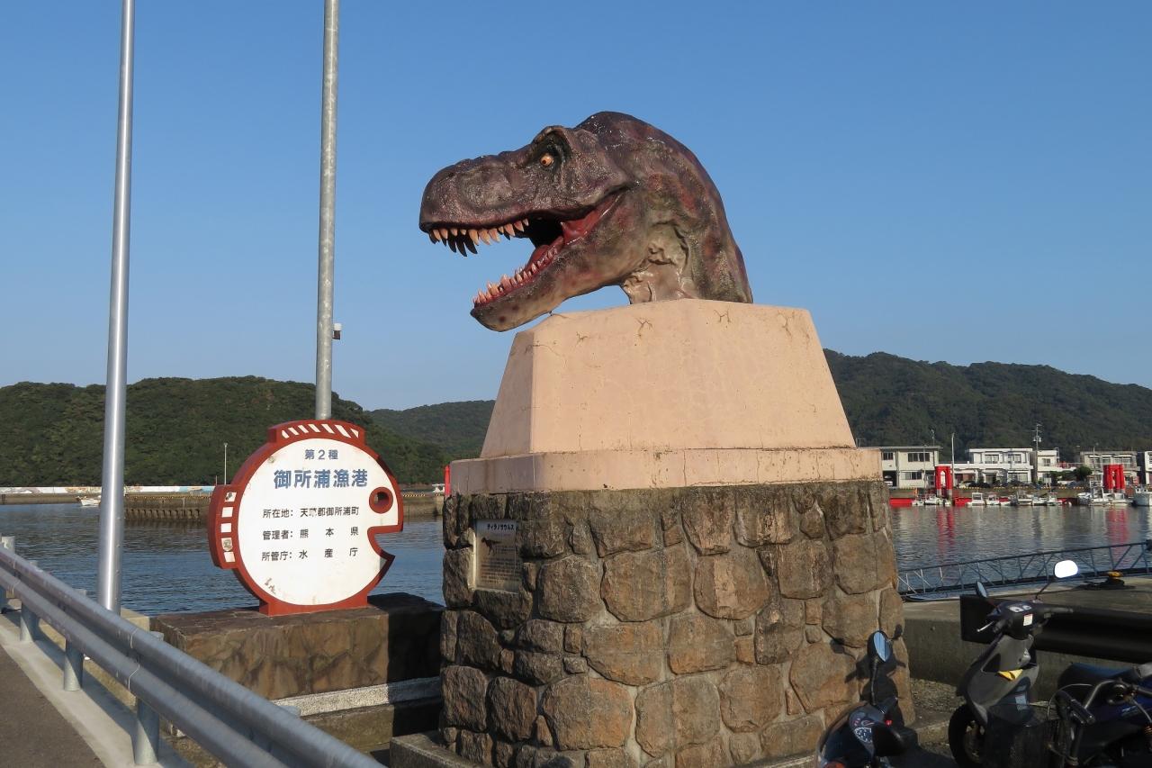 旅の出発地・御所浦港に行くと、ティラノサウルスがお見送り。 -
