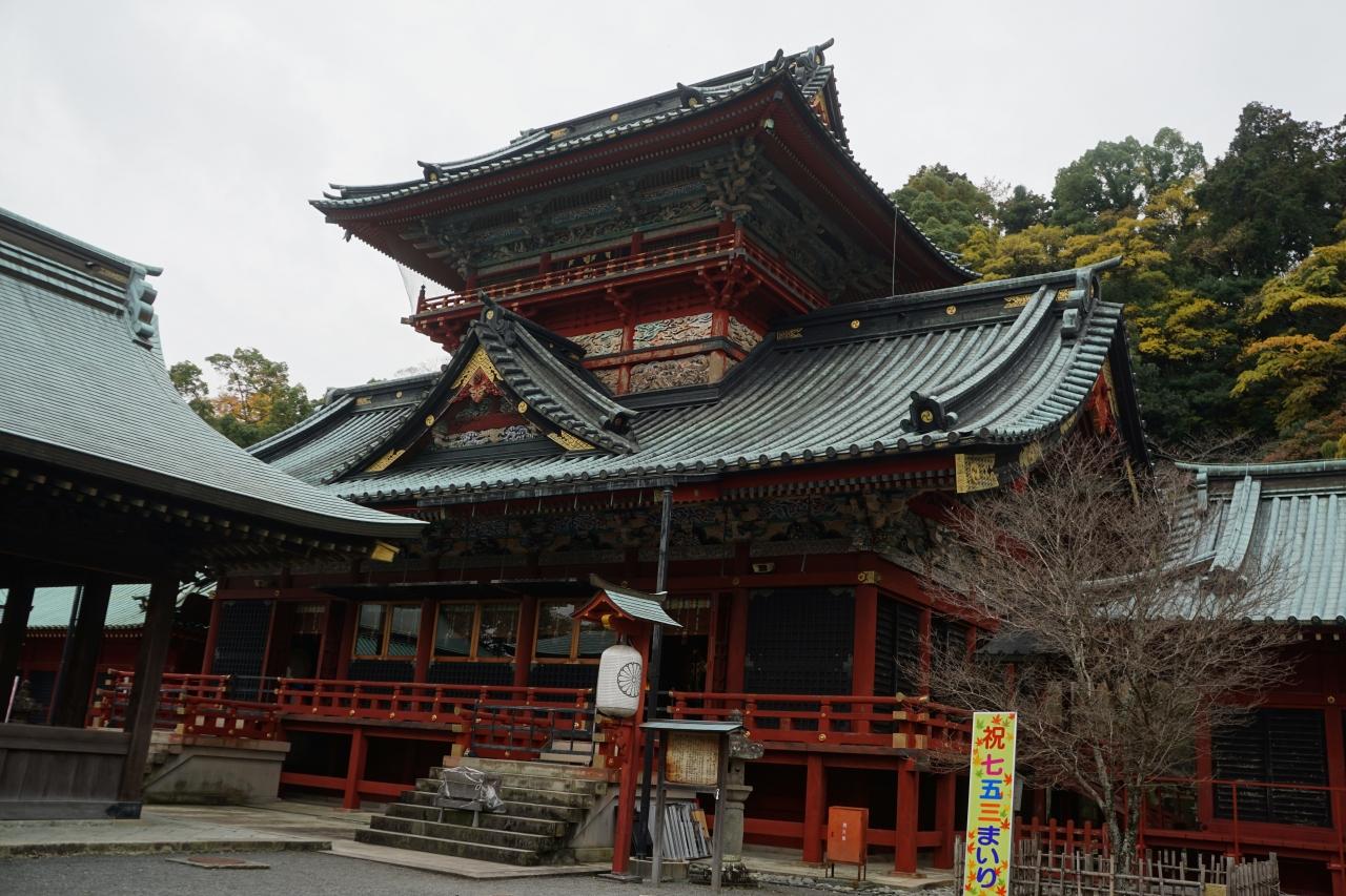 文化13年に竣工。二層の巨大な建物ですが、なんと総漆塗。また、水呑の龍、虎の子渡しなどの彫刻もありますが、境内を外の世界と隔離するかのような壮麗な構えがまずは独特の持ち味かなと思います。 -