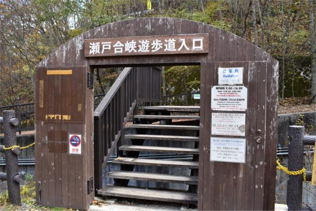 建物の右側に、「瀬戸合峡遊歩道入り口」