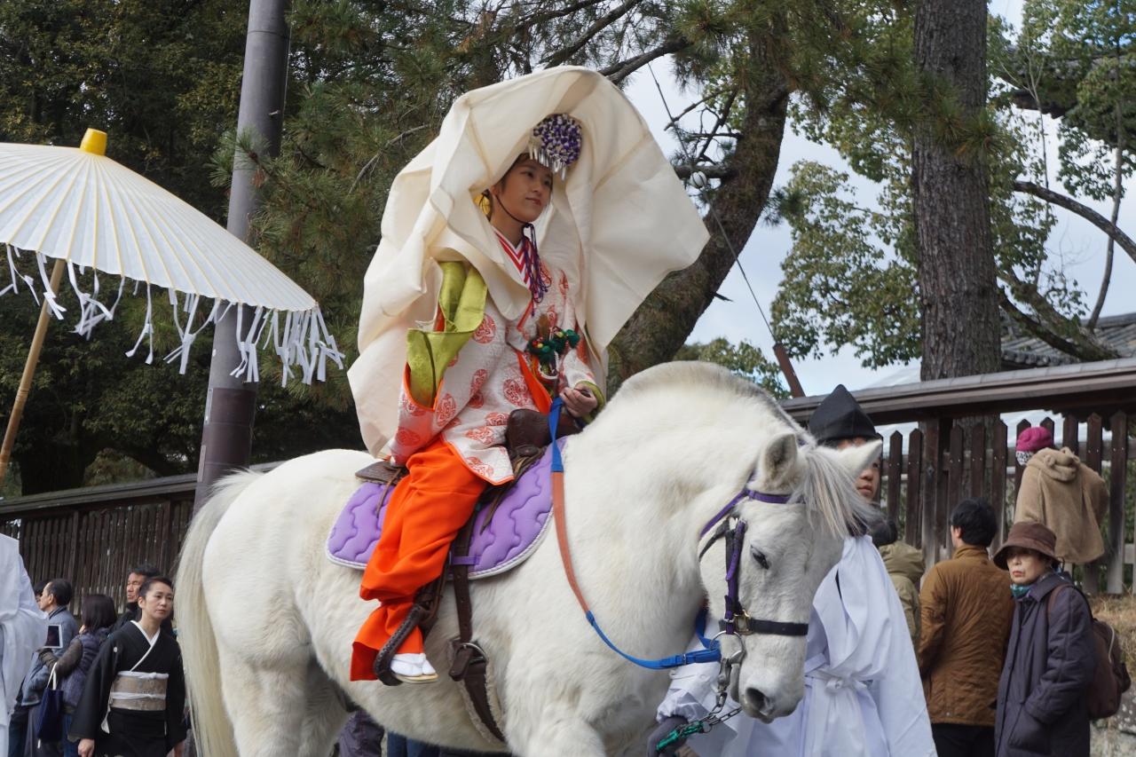 白の被衣(かずき)をいただき、風流傘を差しかけられながら騎馬で進みます。