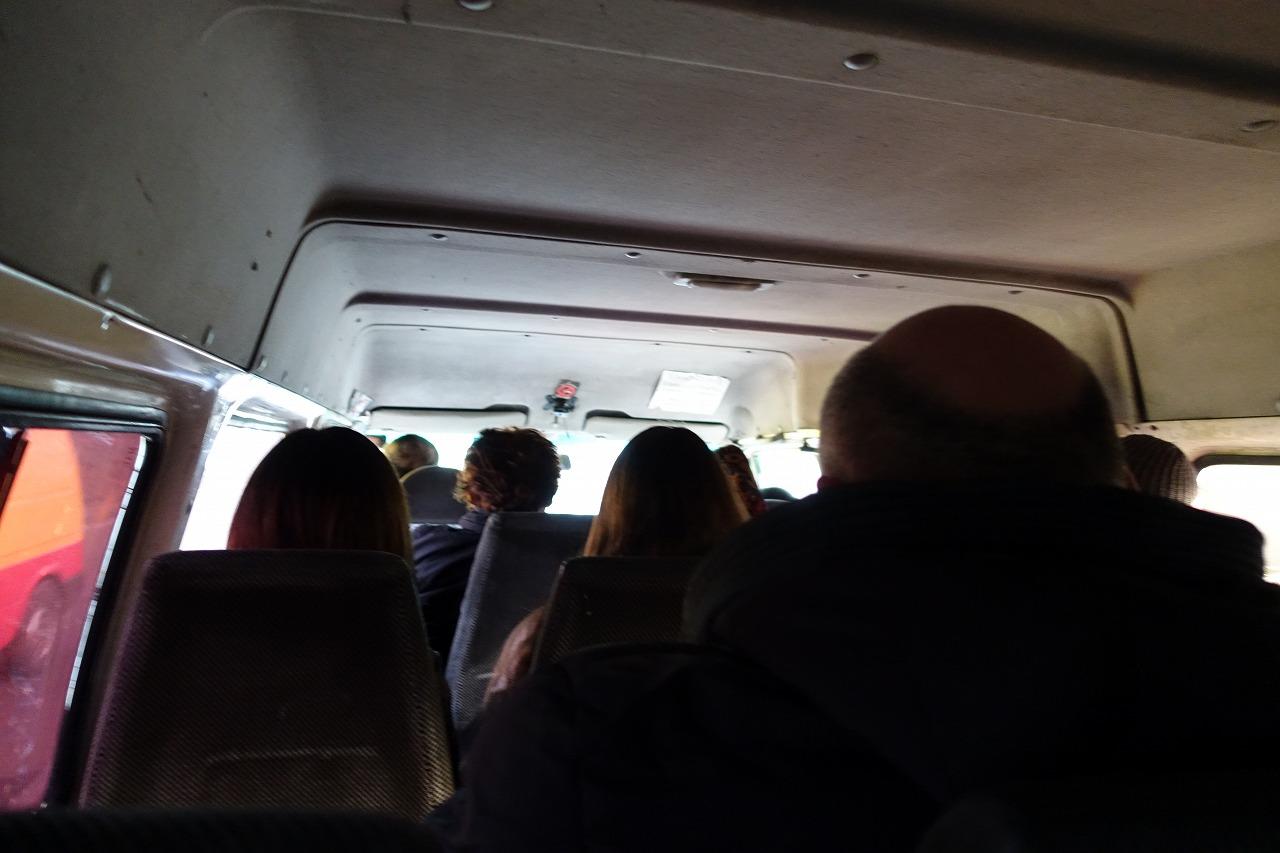 マルシュルートカは普通のマイクロバス。結構年代物で、お世辞にもきれいとは言えません。テラヴィまでは、これを利用するするしか手段はありません。手持ちの大きなリュックが他のお客さんの邪魔になりそうでしたが、うまく膝に抱えて最後尾に乗って出発を待つことにします。