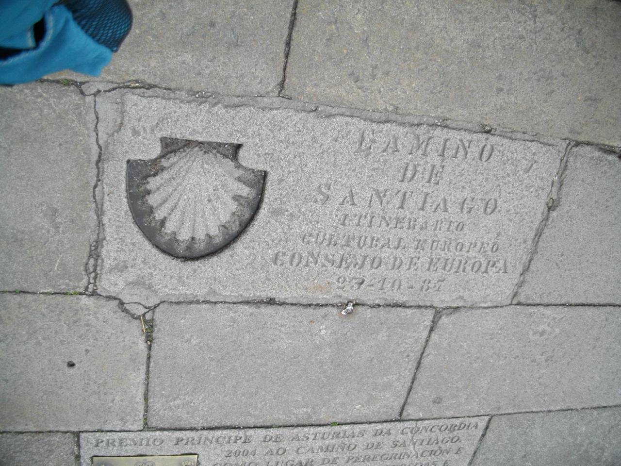カテドラル前の広場には巡礼の道のゴールを示すホタテ貝のマークがある。