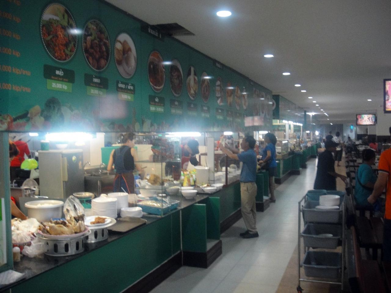 和、中、韓、タイ、ベトナム、ラオス、パスタ、サンドイッチなどの専門店が並びます。料金は1万Kip単位。 -