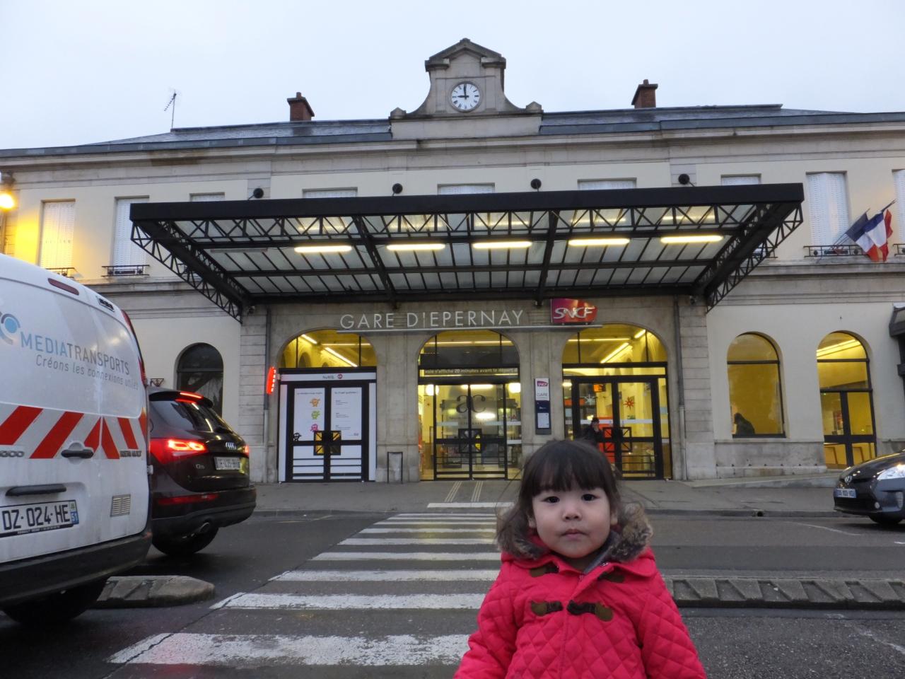 お店を出る頃には雨は上がっていたのですが、他に見に行きたい場所もなく、娘たちも寝ていたため、ヒーターが効いているエペルネ駅構内で時間を潰すことにしました。 -
