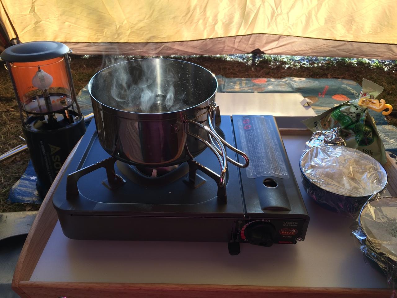 アウトドア用のコンロを購入していないので、普通のお鍋用のコンロで炊きます。ガスは低温でも気化出来るちょいとお高めのものを使用しています。(普通の3倍くらいの金額だったかな?)