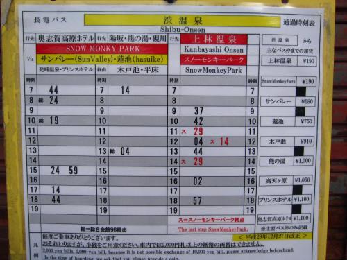 帰りのバスの時間をチェックします。16:39発の湯田中駅行きのバスで渋温泉まで戻ることにしました。長野駅行きのバスもありました。