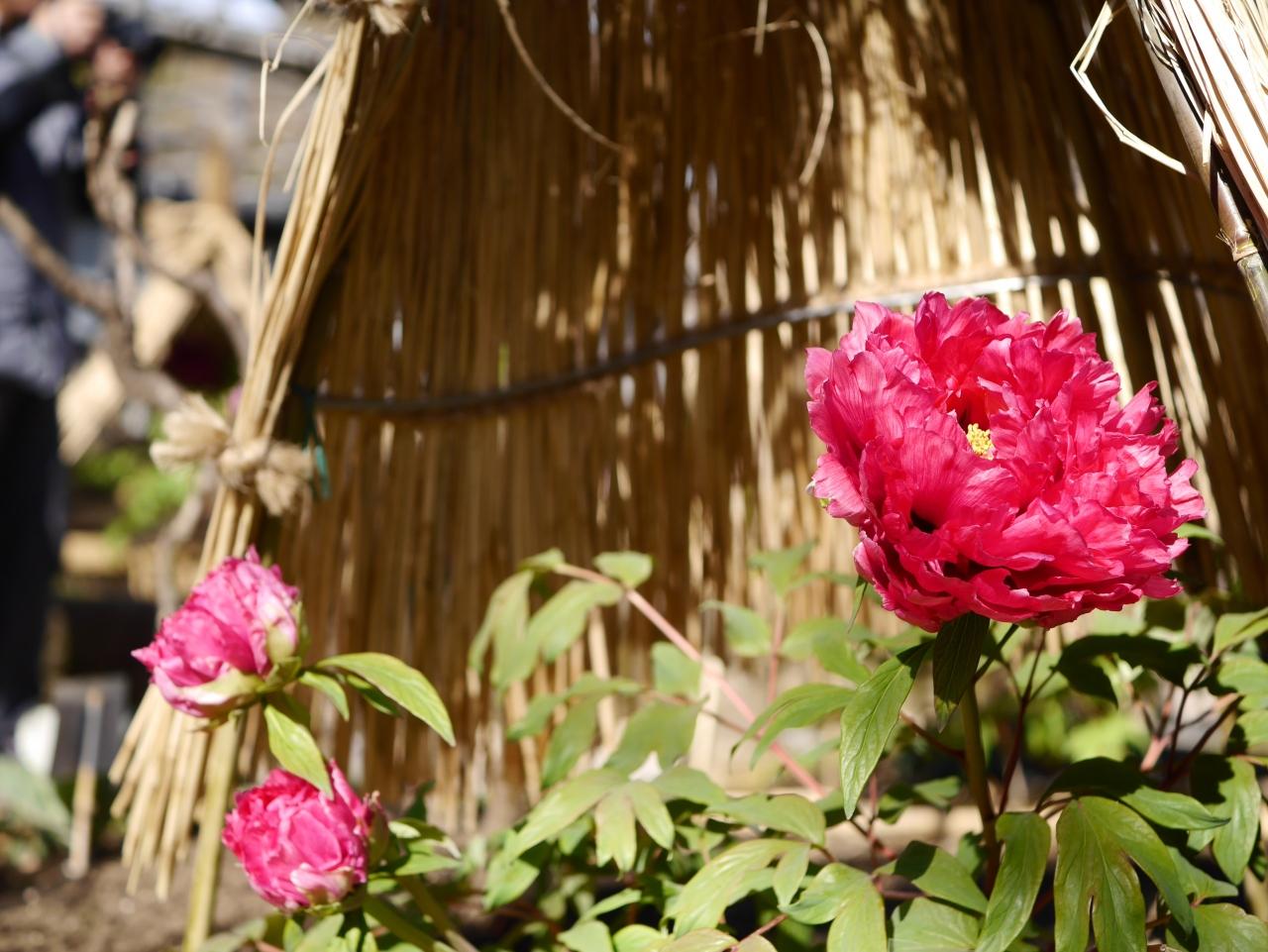 平成27年にリニューアルされた苑内の見所は「お休み処」から眺める光景で、五重の塔を背景に、枯山水の庭園に霜除けのわらぼっちに包まれた牡丹は、“富貴”の象徴として「富貴花」「百花の王」と呼ばれるに相応しい気品が溢れている。