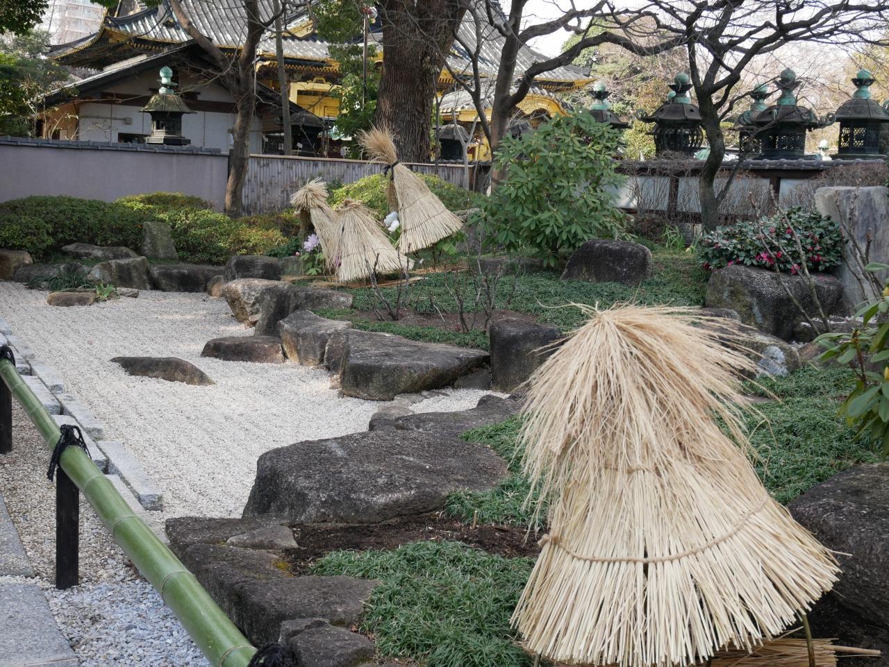 枯山水の庭園に霜除けのわらぼっちに包まれた牡丹