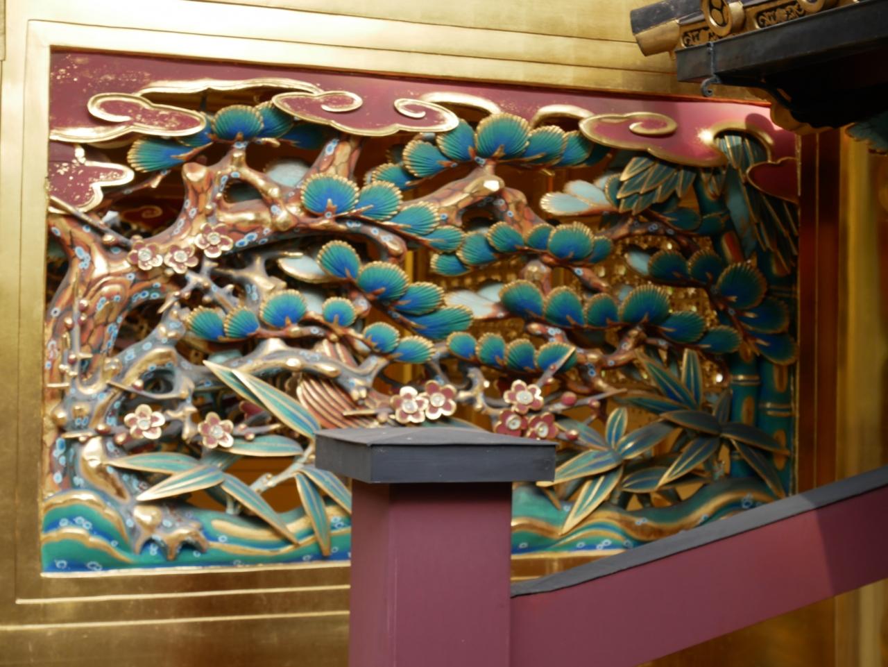 文化財保護の為、社殿内は非公開としております。 金色殿とも呼ばれており、参道側から拝殿、幣殿(石の間)、本殿の三つの部屋から構成される権現造りです。 社殿外壁には豪華な彫刻が施されています。(東照宮HPより) -