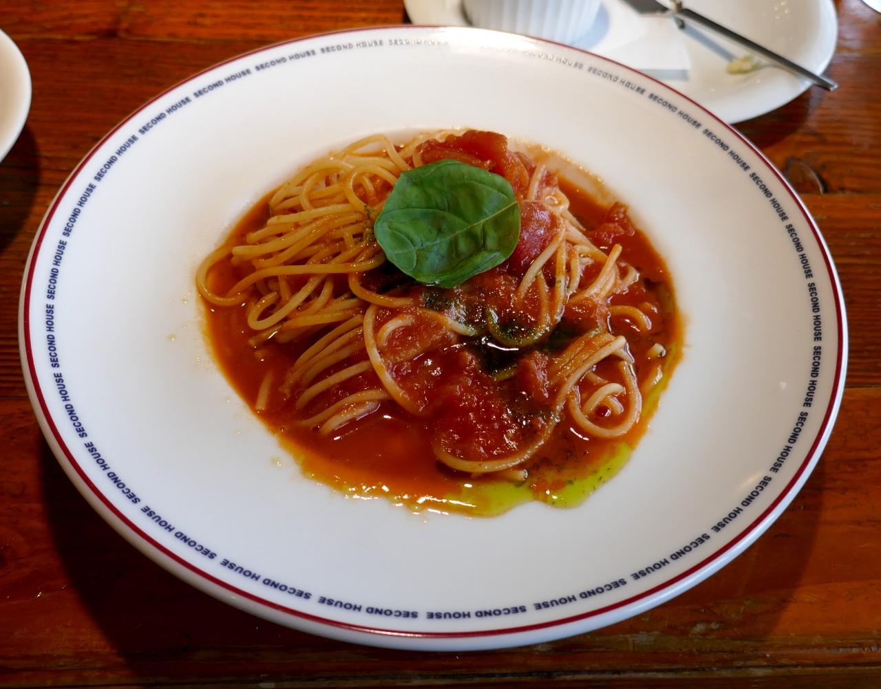 チーズとバジリコのスパゲティ しかしこのトマトソースおいしかった これだけで合格! 麺も乾麺だがアルデンテでおいしい.
