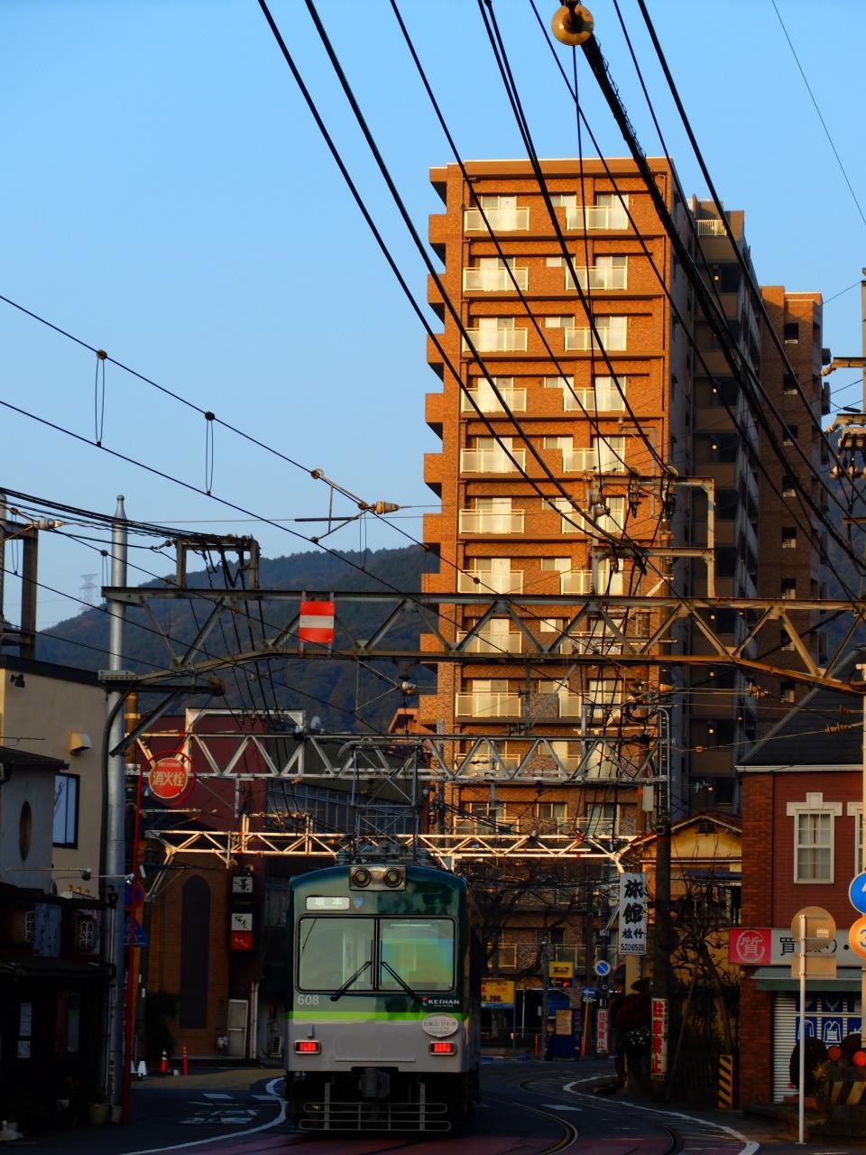大津市役所の前で踏切を待っていると京阪電車が横切りました。