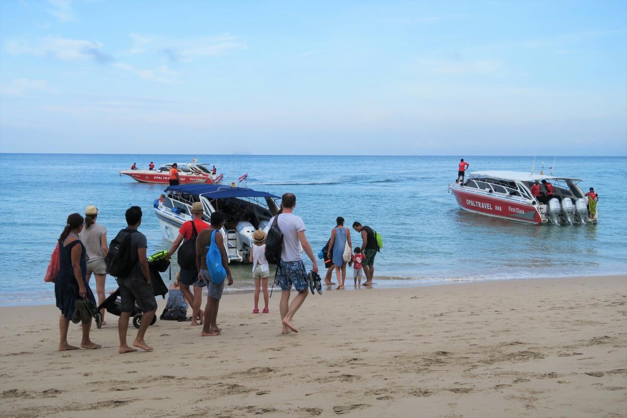 ランタ島からのスピードボートツアーは今回参加するロック島以外にも、ンガイ島、クラダーン島、ムック島、マ島の4島巡りやピピ島周辺を巡るツアーがあります。多くのボートが来るので係員に乗船する船の番号を確認しておく必要があります。乗船は波打ち際を歩き、膝まで水に浸ります。
