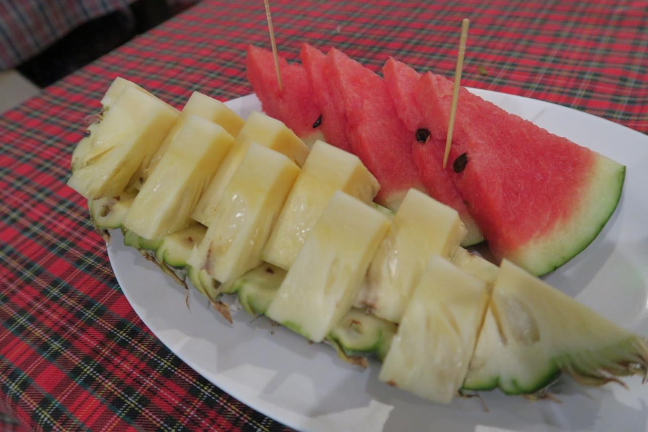 あっという間に帰る時間に。ロック・ノイ島で降りた人を拾ってランタ島に戻ります。ふるまわれたスイカとパイナップルが美味い。フルーツタイムのあとにスタッフがチップの集金。写真もとってくれたので40バーツ渡しました。