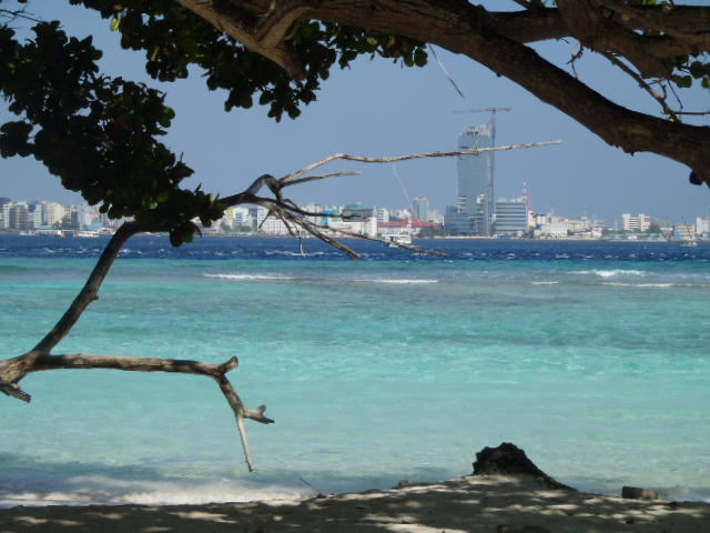 Villingili島のビーチサイドから眺める首都・マレの町並みの写真を数枚撮り、