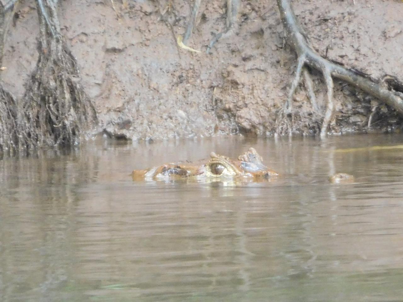 顔の一部しか水面から出していませんが、何でしょうか。このような大きな動物が川の中にいるのですね。