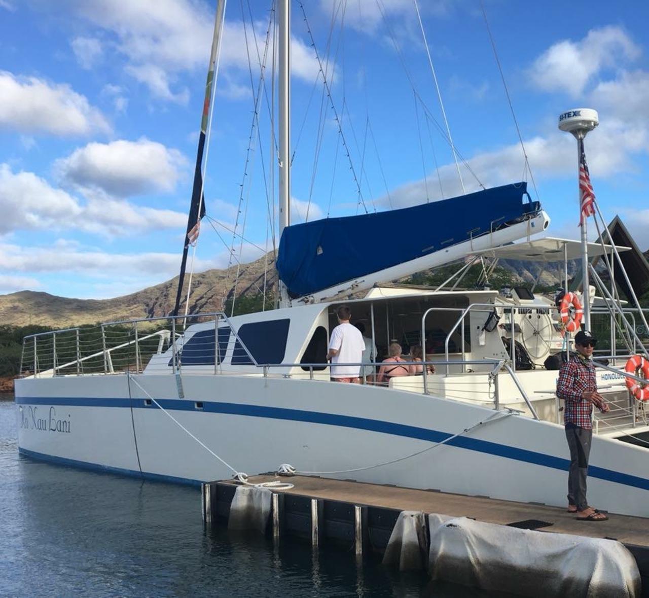 マリオットコオリナのコンシェルジュのアクティビティで予約したドルフィンウォッチング&シュノーケルツアー。8時にホテルピックアップ。バスでコオリナより更に西のワイアナエへ。そしてこの船で出発です。